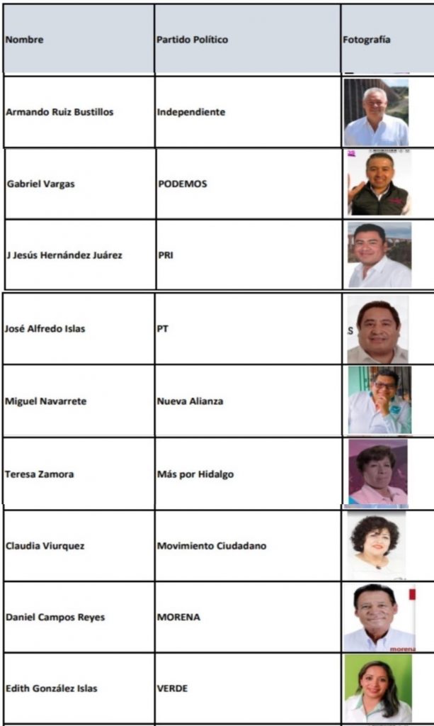 La contienda inicio con los siguientes candidatos: Aline Loreny Ortiz-PAN; Armando Ruiz-Independiente; Claudia Viurquez-Movimiento Ciudadano; Daniel Campos-MORENA; Edith González-Verde Ecologista; Gabriel Vargas-PODEMOS; Jesús Hernández-PRI; José Alfredo Islas-PT; Miguel Navarrete-NUEVA ALIANZA; Miriam Rosales-PRD; Teresa Zamora-Más por Hidalgo, así como Yureli Zarco-Encuentro Social.