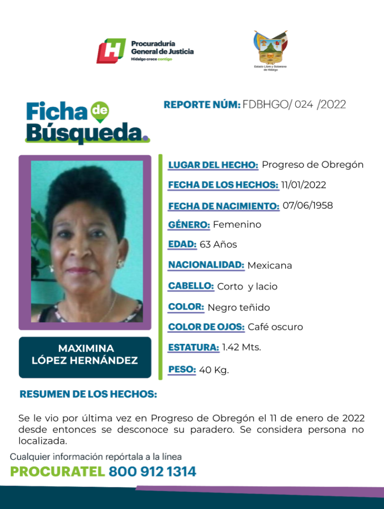 * MAXIMINA LÓPEZ HERNÁNDEZ, a quien se le vio por última vez el 11 de enero de 2022 en #ProgresoDeObregón.