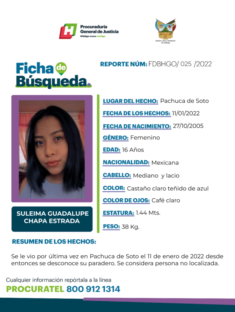 * SULEIMA GUADALUPE CHAPA ESTRADA a quien se le vio por última vez el 11 de enero de 2022 en #Pachuca de Soto.