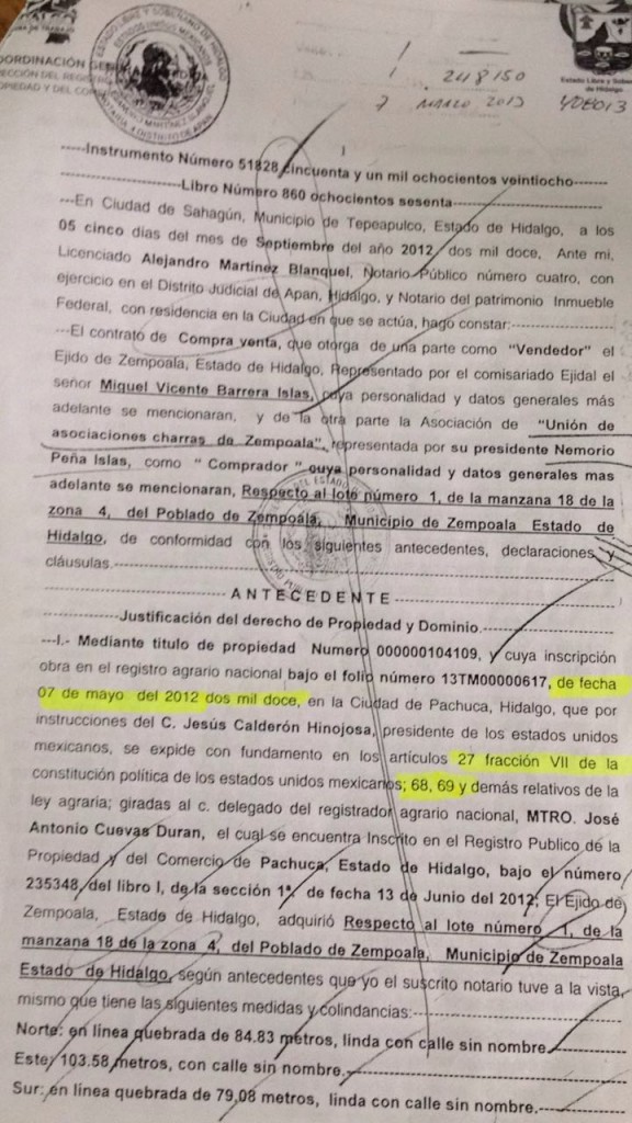 La escritura está fechada 5 de septiembre del año 2012, fue elaborada en la notaría pública 4 de Ciudad Sahagún, establece que Miguel Vicente Barrera Islas, entonces Presidente del Comisaria Ejidal, en forma unilateral e ilegal transfirió la propiedad a La Unión de Asociaciones Charras de Zempoala, representada por Nemorio Peña Islas en calidad de comprador.