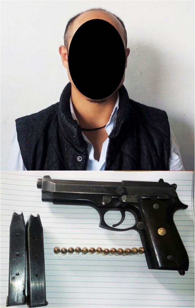 Los policías estatales decidieron intervenir dicha unidad. Al conductor le fue solicitada una revisión corporal y de la unidad, en la que le fue hallada un arma de fuego tipo escuadra, color negro, con dos cargadores, uno abastecido con 5 cartuchos útiles y otro con 8 cartuchos, calibre 9 milímetros.