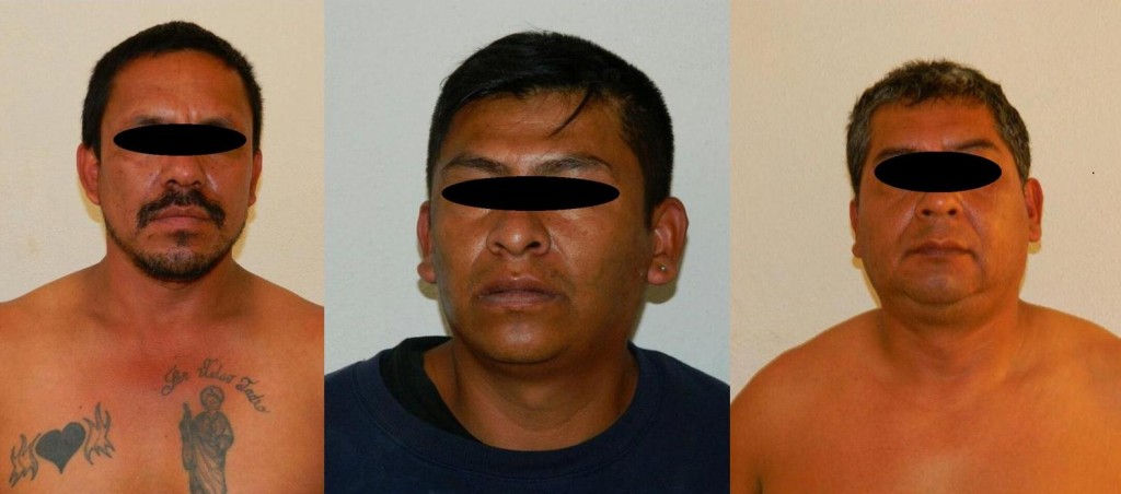 Los detenidos son Rogelio Conrado “B” “N”, Víctor Hugo “P” “G” y Porfirio Gaspar “G” “N” de 34, 40 y 45 años de edad, respectivamente, vecinos de la colonia El Cuernito, delegación Álvaro Obregón, en la Ciudad de México.