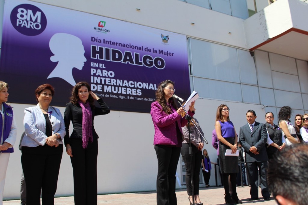 Durante el Paro Internacional de Mujeres realizado en la explanada de Plaza Juárez de Pachuca, para conmemorar el Día Internacional de la Mujer, la titular de la Secretaría del Trabajo y Previsión Social de Hidalgo, María de los Ángeles Eguiluz Tapia, señaló que esta conmemoración es una oportunidad para destacar que aún hay retos pendientes de superar si se desea lograr el ejercicio pleno de los derechos de las mujeres.