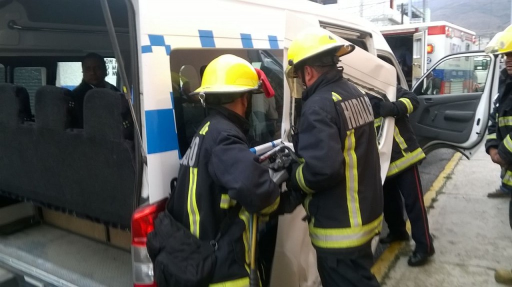Presuntamente, una ambulancia de la Cruz Roja con número económico 127 salió para atender una emergencia en el bulevar Minero, pero en el trayecto se impactó contra la parte lateral derecha de una camioneta Nissan Urvan, del servicio público Ruta 47, placas 026-758-G que cubría la ruta Carboneras- Fraccionamiento Colosio.
