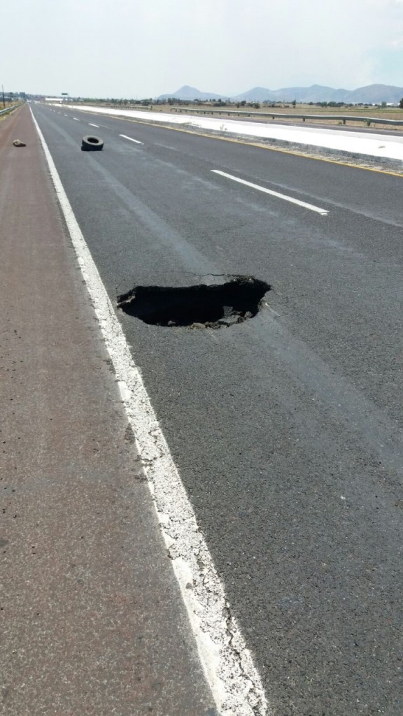 Explicaron que se detuvieron a observar el “bache” y pudieron corroborar que por lo menos tiene cuatro metros de profundidad, así que al paso de un vehículo con exceso de peso podría quedar atrapado por el riesgo de que se haga más grande el hueco que se localiza a escasamente tres kilómetros de Ciudad Sahagún en el carril que conduce a Pachuca.
