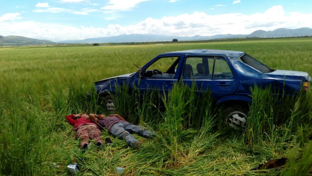 Oficiales de Seguridad Municipal fueron los primeros de llegar al lugar del accidente donde encontraron entre los cultivo de cebada un automóvil Volkswagen, tipo Jetta, color azul, placas XWM-7838, estaba destruido y en su exterior los tres ocupantes malheridos.