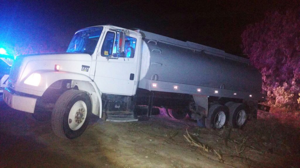 En Atotonilco de Tula, sobre un camino de terracería de la comunidad de Conejos, detectan una pipa de color blanco, con placas de circulación del Estado de México, con capacidad para 20 mil litros, con combustible.