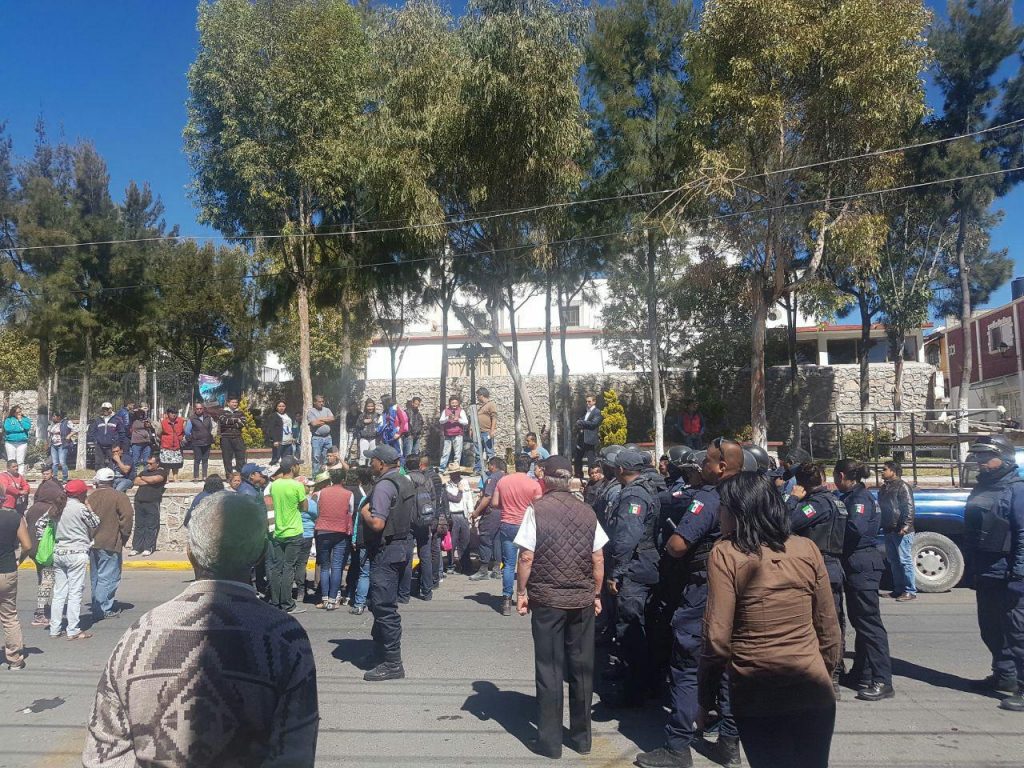 MINERAL DE LA REFORMA, Hgo.- Nutrido grupo de tianguistas del fraccionamiento Los Tuzos prendieron una fogata, apedrearon la alcaldía e hicieron correr al cuerpo de Seguridad y Vialidad de este municipio.