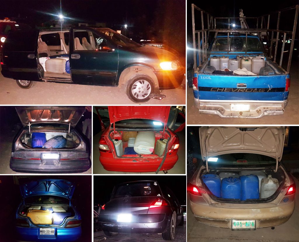 Fueron asegurados un: Ford Escort, color arena, placas del Estado de México; Ford Ikon, color rojo, placas del Estado de México; Nissan Altima, color azul, placas del Estado de México; Chevrolet pick up, color azul, placas del Estado de México; Renault Megane, color gris, placas del Estado de México; Chevrolet Venture, color verde, placas de Hidalgo; y un Ford Thunderbird, color negro, placas del Estado de México.