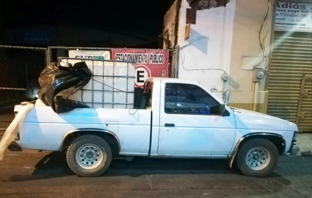 Los elementos encontraron abandonada una camioneta Chevrolet, color blanco, con matrícula del Estado de México, cargada con tres contenedores de mil litros, vacíos, misma que cuenta con reporte de robo vigente; asimismo, una Ford Super Duty, color blanco, con reporte de robo, en cuyo interior se encontraban seis contenedores de mil litros y dos de 200 litros, todos vacíos.