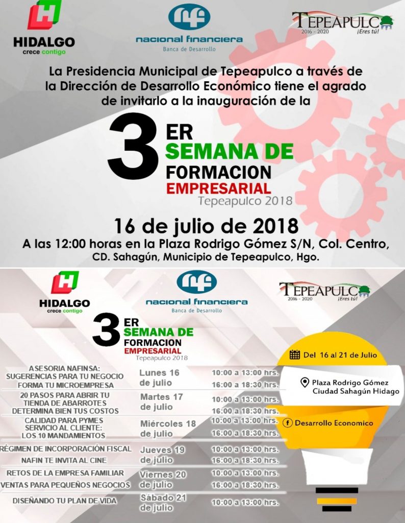 TEPEAPULCO, Hgo. – Los habitantes de Tepeapulco-Sahagún y región del altiplano en general tienen la oportunidad de participar en la Tercera Semana de Formación Empresarial.