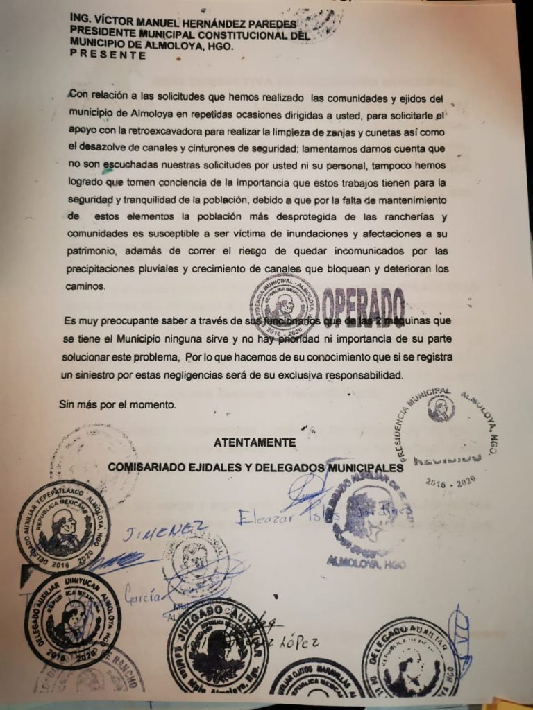En su momento se mencionó que comisariados ejidales y delegados comunales con oportunidad solicitaron los trabajos de mantenimiento o desazolve de cinturones de seguridad y barrancas, sin embargo, la respuesta ha sido que carecen de suficiente maquinaria para atender la demanda de todos las localidades de Almoloya.