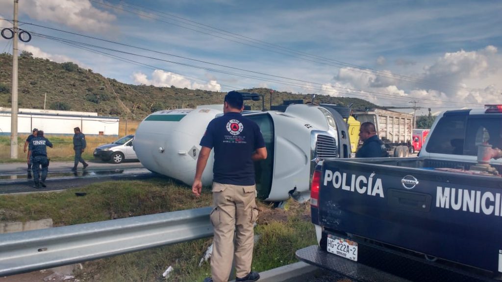 Explican que el camión tipo pipa Internacional, color blanco, con placas de circulación HK2867E, capacidad de 17,500 litros, al 100 por ciento, de la empresa Gas de Apan, pretendió dar vuelta, al parecer sin las adecuadas precauciones.