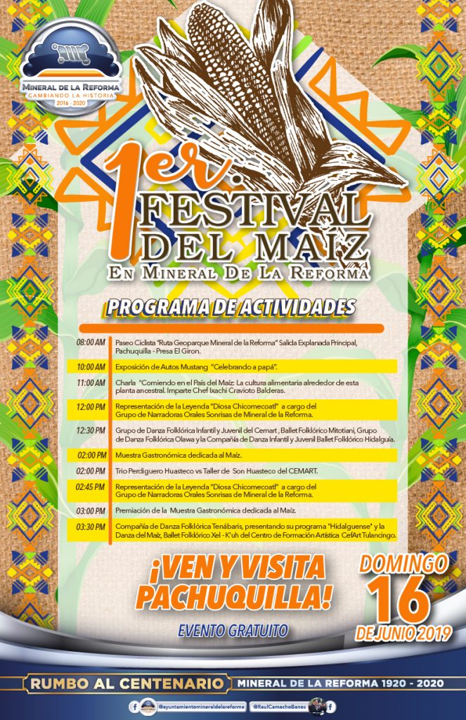 En conferencia de prensa, funcionarios municipales, presentaron el programa de actividades de lo que será el Primer Festival del Maíz en Mineral de la Reforma, 2019 que se realizará el próximo domingo 16 de junio en la explanada principal de Pachuquilla.