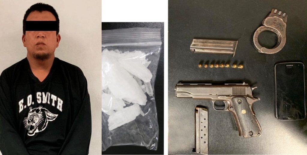 Oficiales estatales detuvieron al sujeto, a quien se le encontró un arma de fuego calibre nueve milímetros, abastecida con ocho cartuchos útiles, así como varias bolsas de plástico que contenían diferentes cantidades de probable droga sintética (cristal).