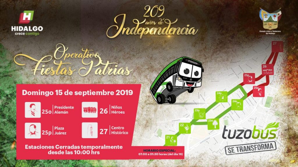 • El horario de servicio a partir de las 7:00 am hasta la 01:30 horas del domingo 16 de septiembre.