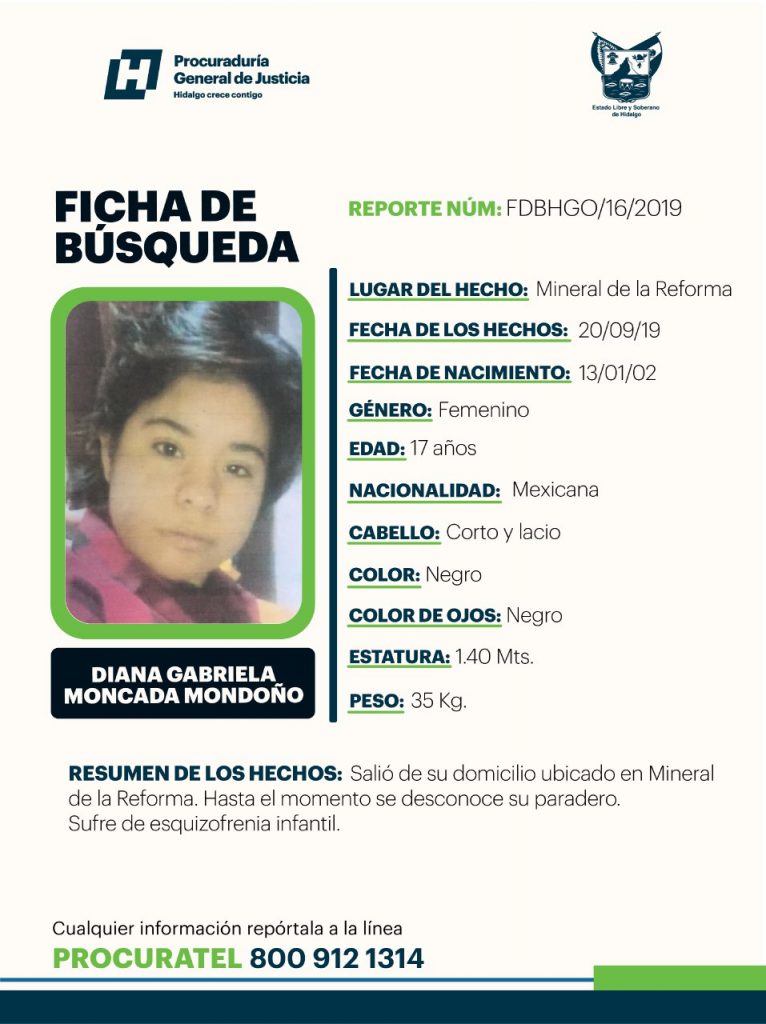 Share Facebook Twitter LinkedIn Pinterest Email Ficha de Búsqueda en favor de Diana Gabriela Moncada Mondoño, quien salió de su domicilio ubicado en Mineral de la Reforma.