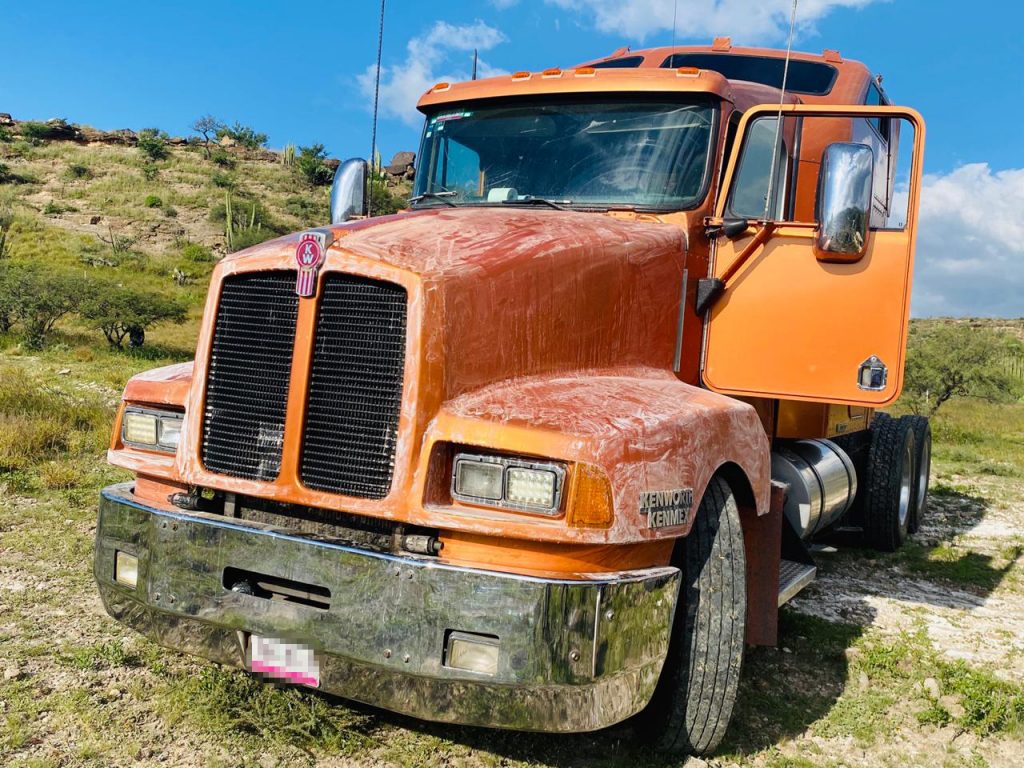 • Marca Kenworth, color naranja, con placas del servicio público federal.
