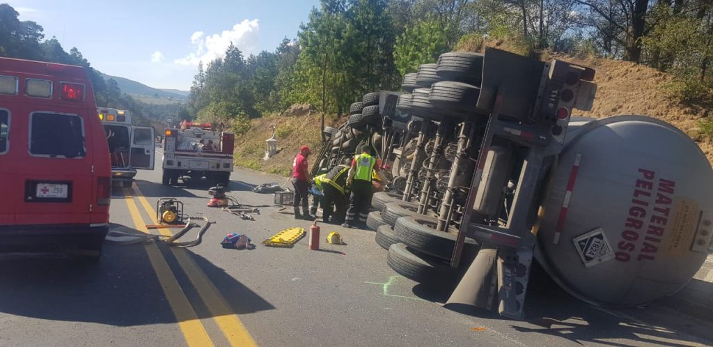 - Tractocamión Kenworth, color blanco, acoplado a semiremolque tipo tanque, abastecido con producto, sin derrame.