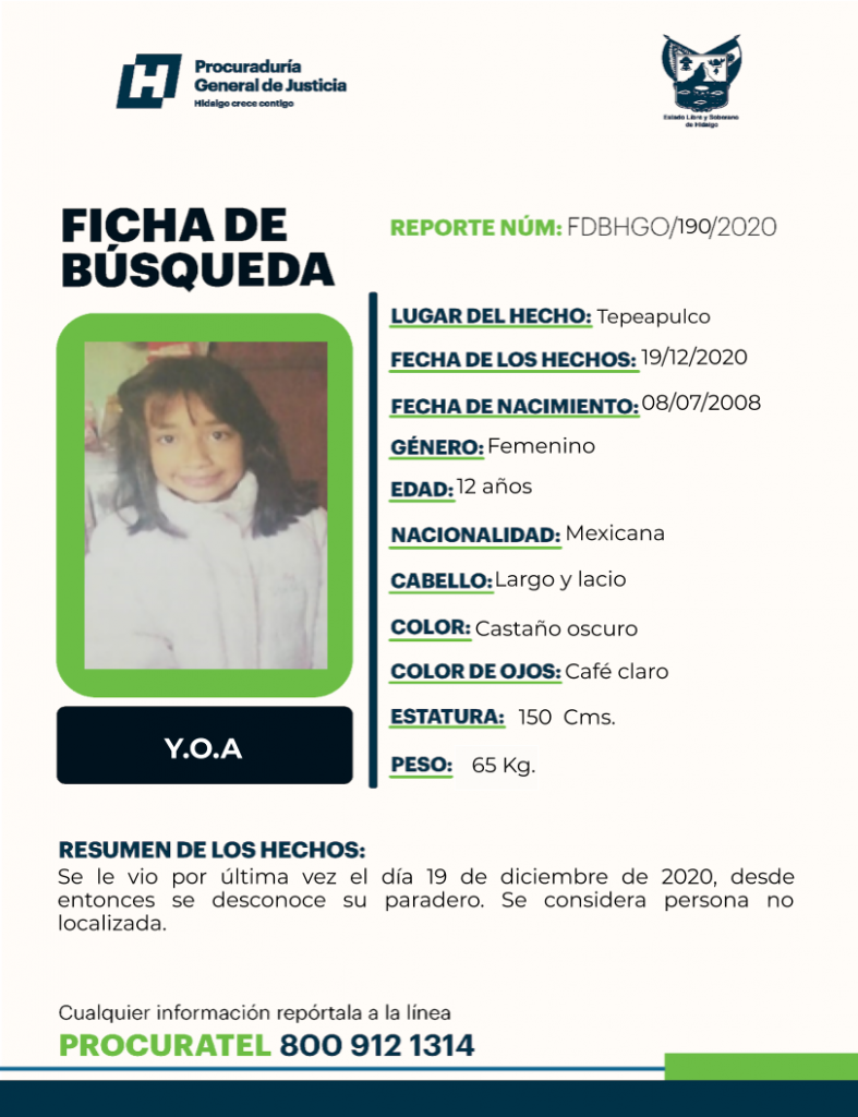 TEPEAPULCO, Hgo.- Estimados lectores, seguidores y amigos en general de EL REPORTERO, solicitamos su ayuda para que compartan esta publicación y apoyemos en la localización de la pequeña Y.O.A., sus familiares la esperan en su hogar.