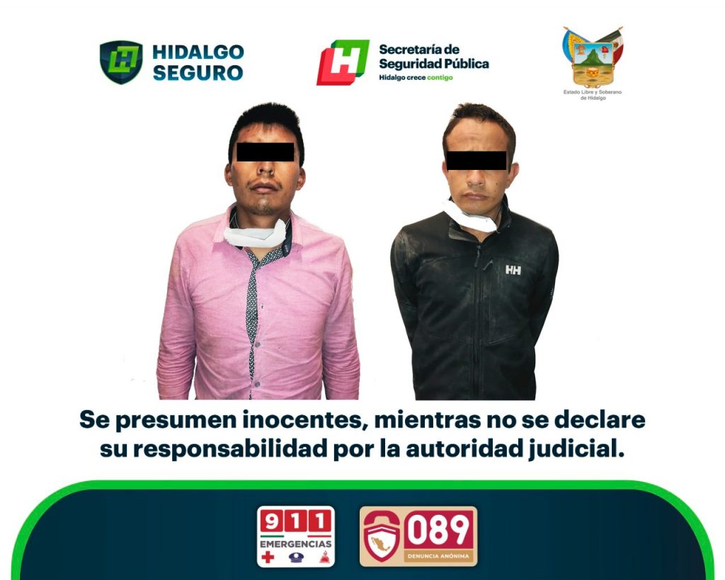 Se identificaron como M.H.H., de 32 años, con domicilio en Mineral del Chico; y N.Z.S., de 24 años, procedente de Huasca de Ocampo, mismos que quedaron a disposición del Ministerio Público del fuero común para los trámites legales.