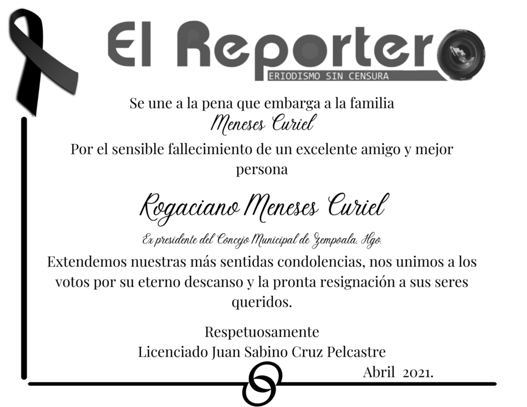 Zempoala, Hgo.- El ingeniero Rogaciano Meneses Curiel falleció el día de hoy, la clase política de Hidalgo y, especialmente de Zempoala lamenta su deceso.