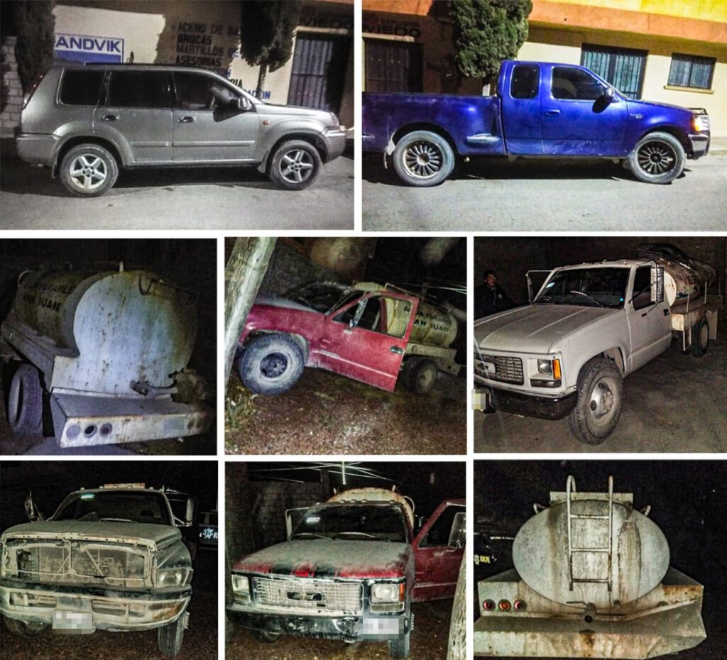 En las acciones fueron aseguradas tres camionetas habilitadas como pipas, que transportaban más de diez mil litros de hidrocarburo, y dos unidades particulares más.