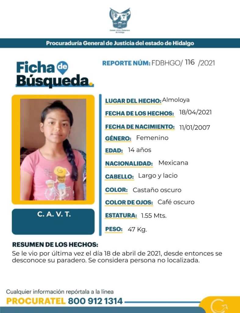 Estimados lectores, seguidores y amigos en general de EL REPOIRTERO, solicitamos su colaboración para la ACTIVACIÓN de las Fichas de Búsqueda para localizar a SARA BARRIOS JAIME, a quien se le vio por última vez el 16 de abril de 2021 en Cuautepec de Hinojosa; a PLÁCIDO ALVARADO RUIZ, quien fue visto por última vez el 18 de abril de 2021 en Tolcayuca y a C. A. V. T., fue vista por última vez el 18 de abril de 2021 en Almoloya; hasta el momento se desconoce su paradero. Se consideran personas no localizadas.