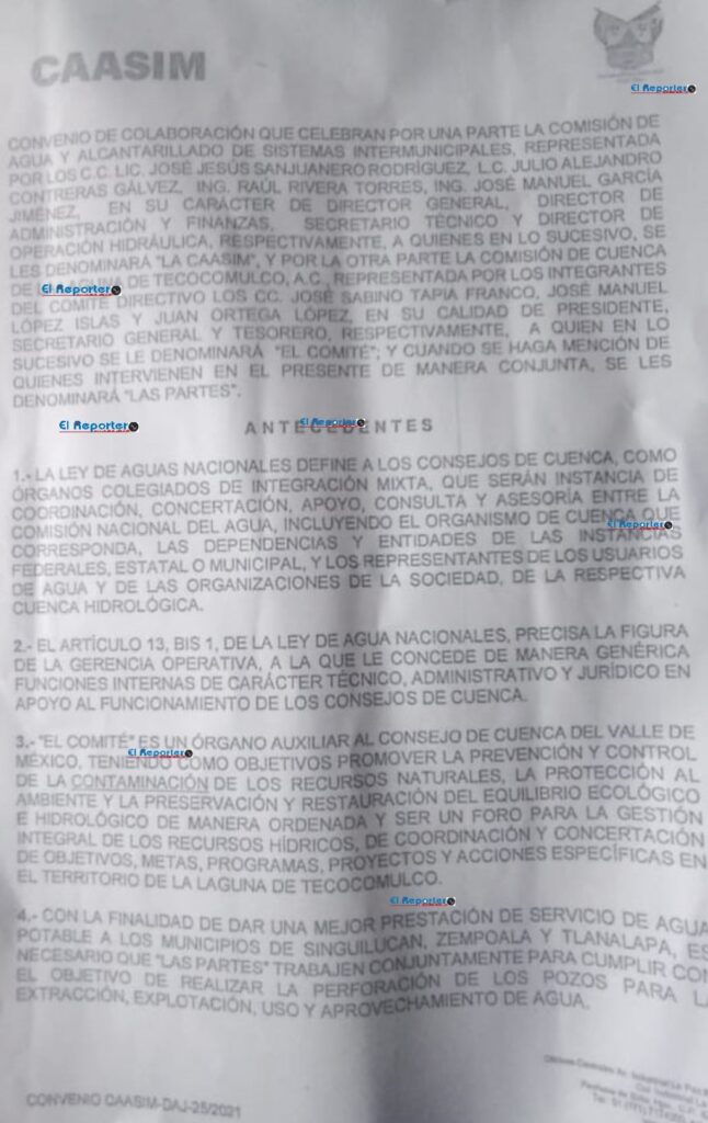 Vecinos de Tepeapulco hicieron llegar a la redacción de EL REPORTERO fotografías del convenio en parte ilegible, sin embargo, ha quedado claro que la CAASIM seguirá explotando los pozos que tiene concesionados para llevar agua a los municipios con los que tenga acuerdos.