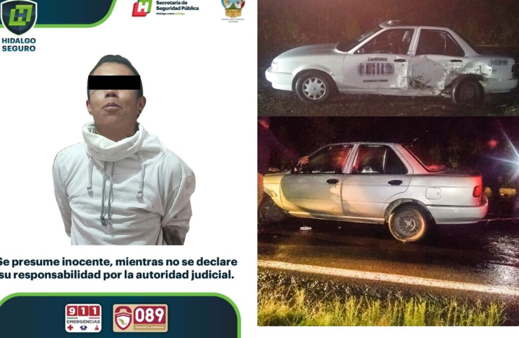 OMITLÁN DE JUÁREZ, Hgo.- En acción de respuesta inmediata, agentes de la Secretaría de Seguridad Pública de Hidalgo detuvieron a una persona presuntamente relacionada con el robo de un vehículo en el municipio de Omitlán, en el que se dio a la fuga y chocó contra un taxi.