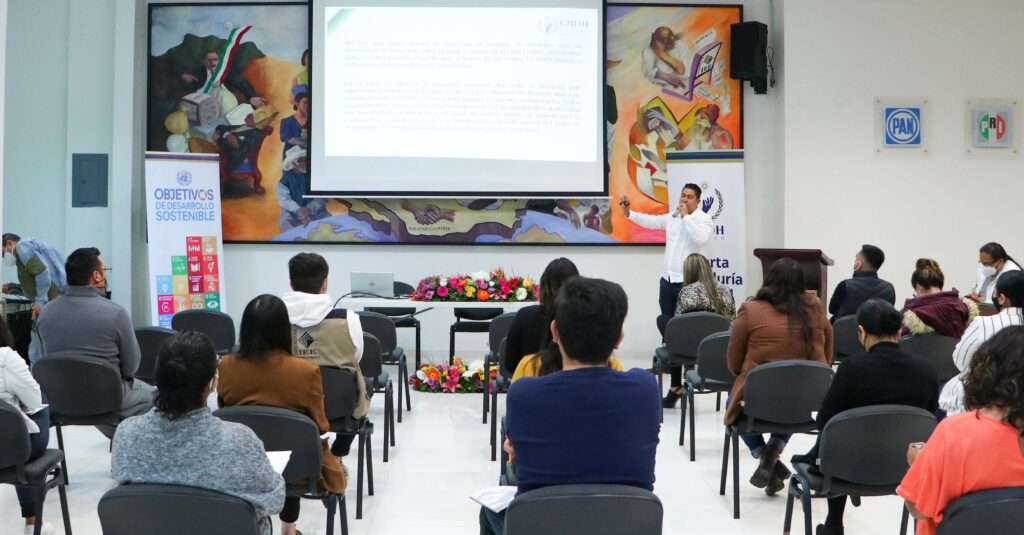 Aurora Urdapilleta Morales, Paulo Sergio Martínez Sumuano y Ángel Miguel Cruz Cervantes, personal adscrito a la cuarta visitaduría de la CNDH, impartieron 3 talleres denominados: “Identidad y Sistemas Normativos de los Pueblos Indígenas”, “Interculturalidad, Género y DDHH de los Pueblos y Comunidades Indígenas” y “Derecho a la Consulta de los Pueblos y Comunidades Indígenas”, en los que destacaron la importancia del reconocimiento de los derechos de los pueblos indígenas y la necesidad de que formen parte activa en la toma de decisiones de los gobiernos, particularmente cuando las acciones emprendidas van a representar un cambio o afectación en sus territorios o sistemas comunitarios.