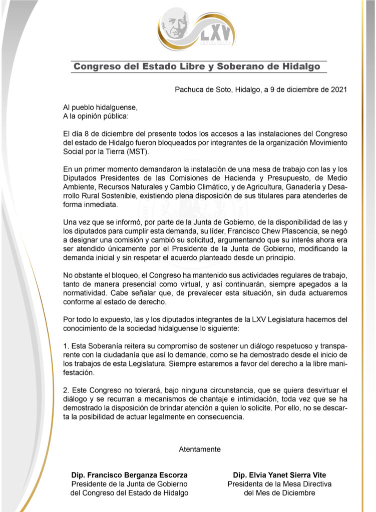 Hoy, El congreso del estado de Hidalgo hace referencia a una situación que emprendió la organización Movimiento Social por la Tierra (MST), donde se establece que el líder de la agrupación hizo un petición que fue atendida, sin embargo,  después cambiaron de opinión para agregar otras exigencias.
