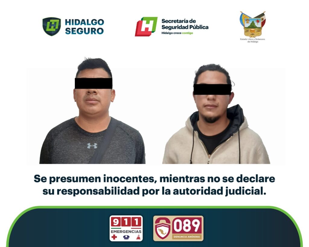 Las personas fueron intervenidas en la antigua carretera México-Pachuca, con dirección a Tecámac, Estado de México. Al ser aseguradas, se idetificaron con los nombres con iniciales L.J.L.S., de 22 años, y A.B.L., de 26, ambos originarios de Ixtapaluca, Estado de México.