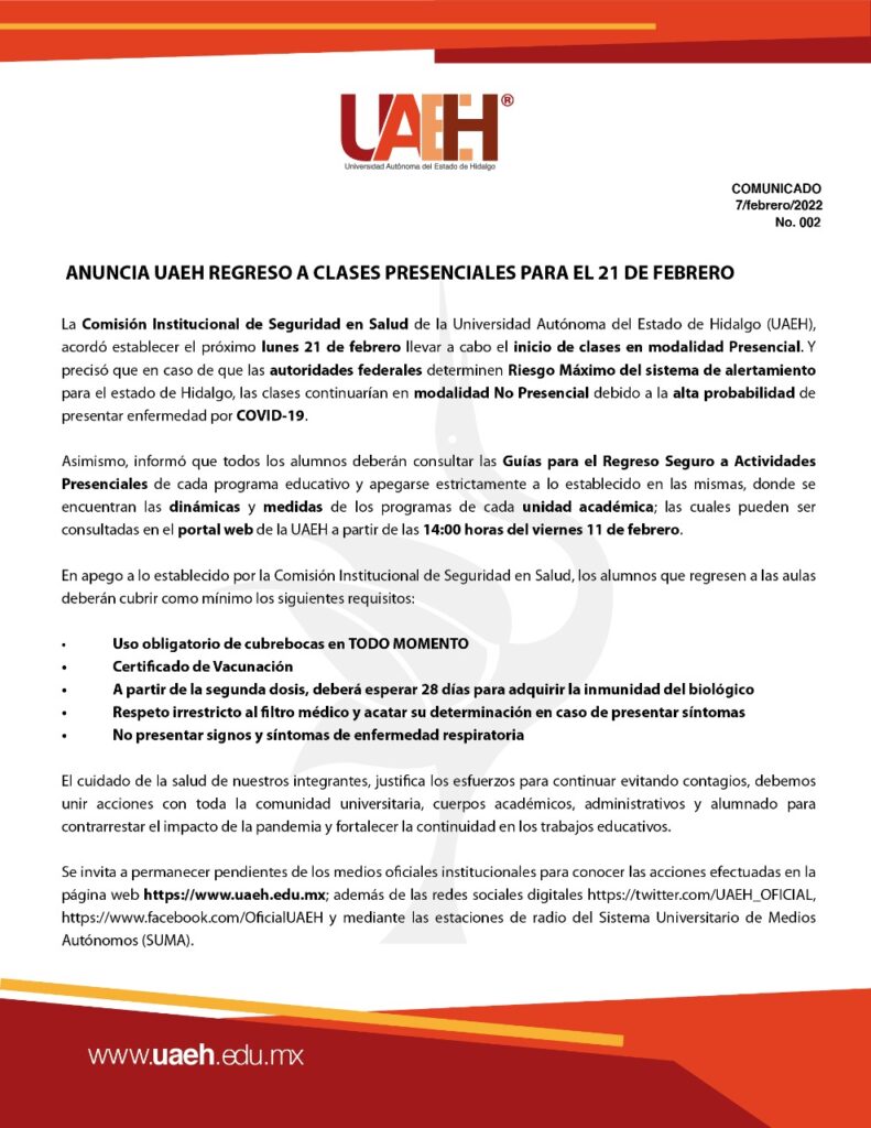 La Comisión Institucional de Seguridad en Salud de la Universidad Autónoma del Estado de Hidalgo (UAEH), acordó establecer el próximo lunes 21 de febrero llevar a cabo el inicio de clases en modalidad Presencial. Y precisó que en caso de que las autoridades federales determinen Riesgo Máximo del sistema de alertamiento para el estado de Hidalgo, las clases continuarían en modalidad No Presencial debido a la alta probabilidad de presentar enfermedad por COVID-19.