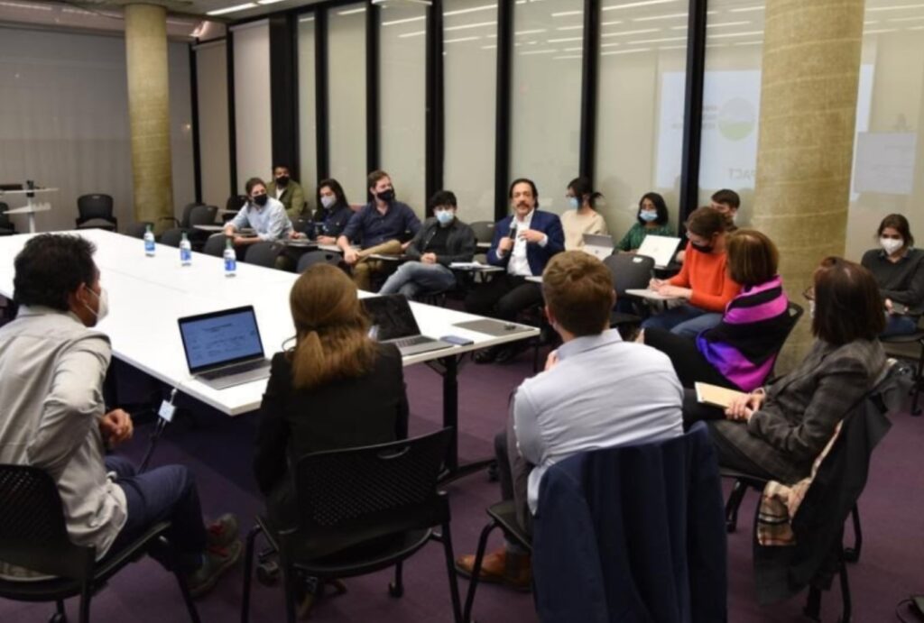 - Durante la reunión de trabajo el gobernador, junto a la doctora Anita Berrizbeitia, directora del Departamento de Arquitectura del Paisaje; la doctora Diane Davis, profesora de Ordenamiento del Territorio y Urbanismo; el doctor Gustavo Madrid, fundador de eeTestudio Arquitectura+Urbanismo, la doctora Lorena Bello Gómez, profesora de Arquitectura del Paisaje y el investigador Samuel Tabory, intercambiaron puntos de vista.