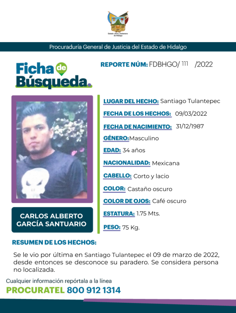 Estimados lectores, solicitamos su amable colaboración en difundir la ficha de búsqueda para localizar a CARLOS ALBERTO GARCÍA SANTUARIO a quien se le vio por última vez el 9 de marzo de 2022 en Santiago Tulantepec.