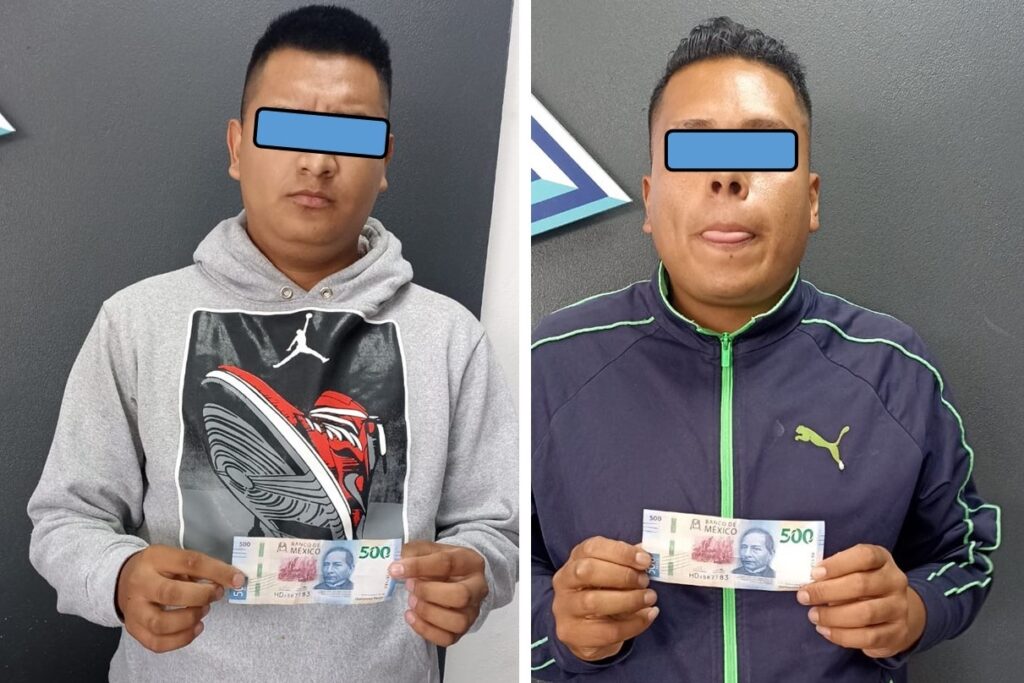 Tenían en su poder billetes apócrifos de 500 pesos, se identificaron con sus iniciales como M.M.T y F.G.P. de 26 y 23 años, respectivamente, ambos provenientes de Ecatepec de Morelos, Estado de México.