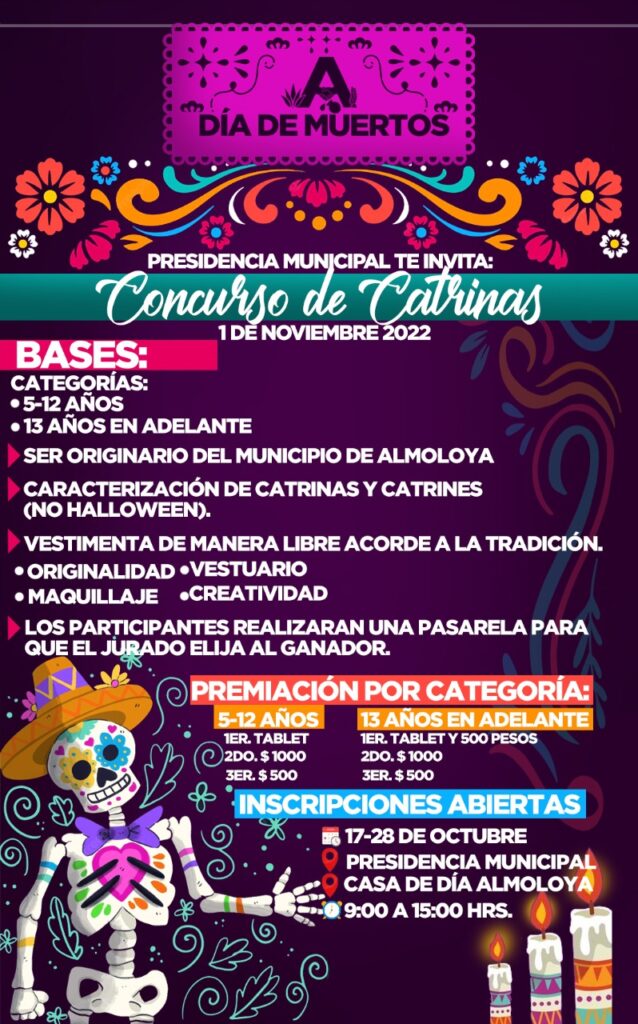 ALMOLOYA, HGO. – Con la finalidad de la próxima celebración de “El Día de Muertos” se ha organizado un concurso de Catrinas con atractivos premios para los participantes.