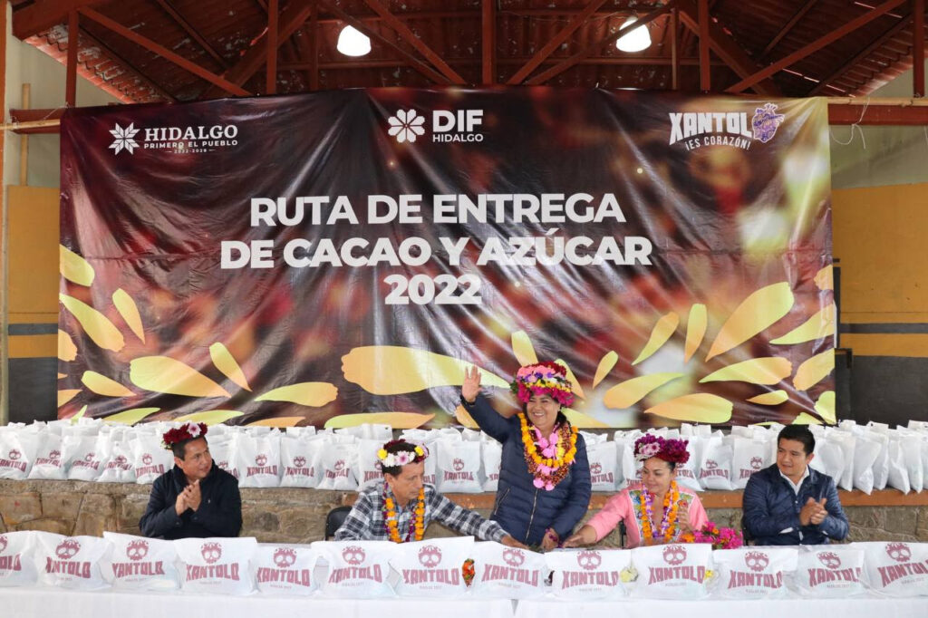 En este acto, realizado en Atlapexco y en el que estuvo acompañada por Reyna Guerrero, titular del Sistema DIF municipal y del alcalde Joel Hernández, se entregaron simbólicamente 350 dotaciones que forman parte de un total de 6 mil 500 paquetes de cacao y azúcar.