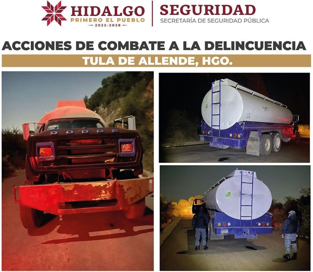 TULA DE ALLENDE, Hgo. – Cerca de 20 mil litros de combustible fueron asegurados por elementos de la Secretaría de Seguridad Pública de Hidalgo, como parte de las acciones para la prevención y combate al trasiego ilegal de hidrocarburos.