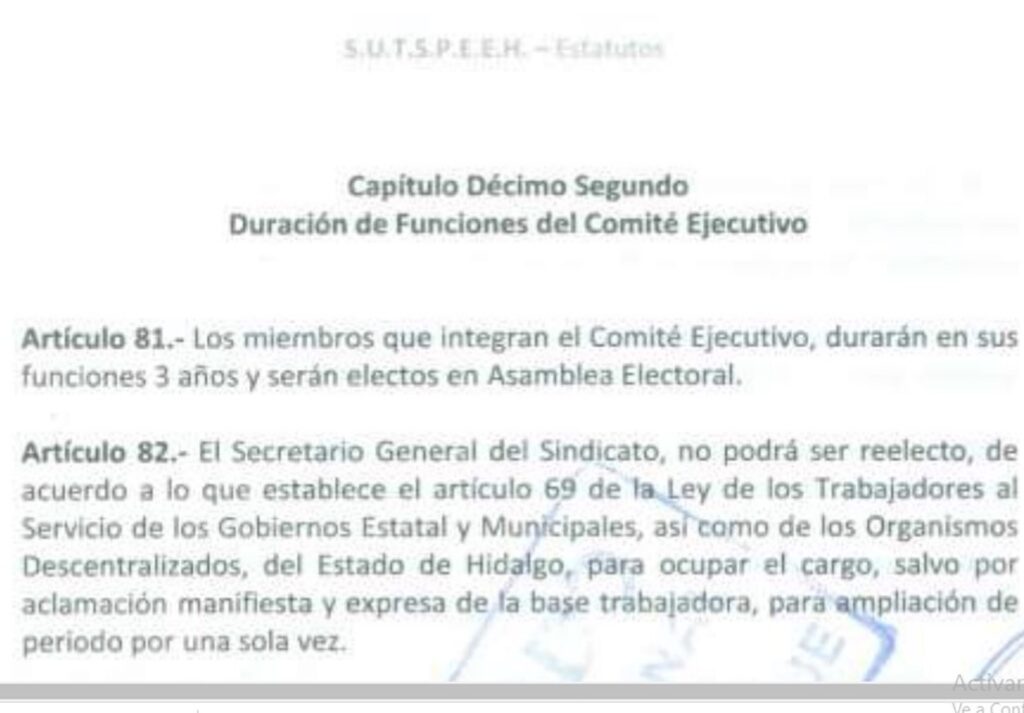 Los artículos 81 y 82 de los estatutos del Sindicato Único de Trabajadores al Servicio de los Poderes del Estado de Hidalgo establecen que el secretario general es electo por un periodo de tres años, por aclamación podrá reelegirse únicamente por otro trienio.