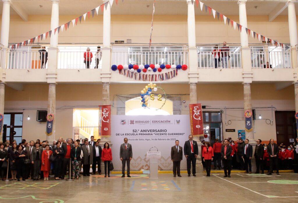Con un pase de lista a las y los integrantes de la primera generación de la escuela primaria “Vicente Guerrero”, el gobernador Julio Menchaca Salazar encabezó los festejos del 52 aniversario de este centro educativo, en la capital hidalguense.