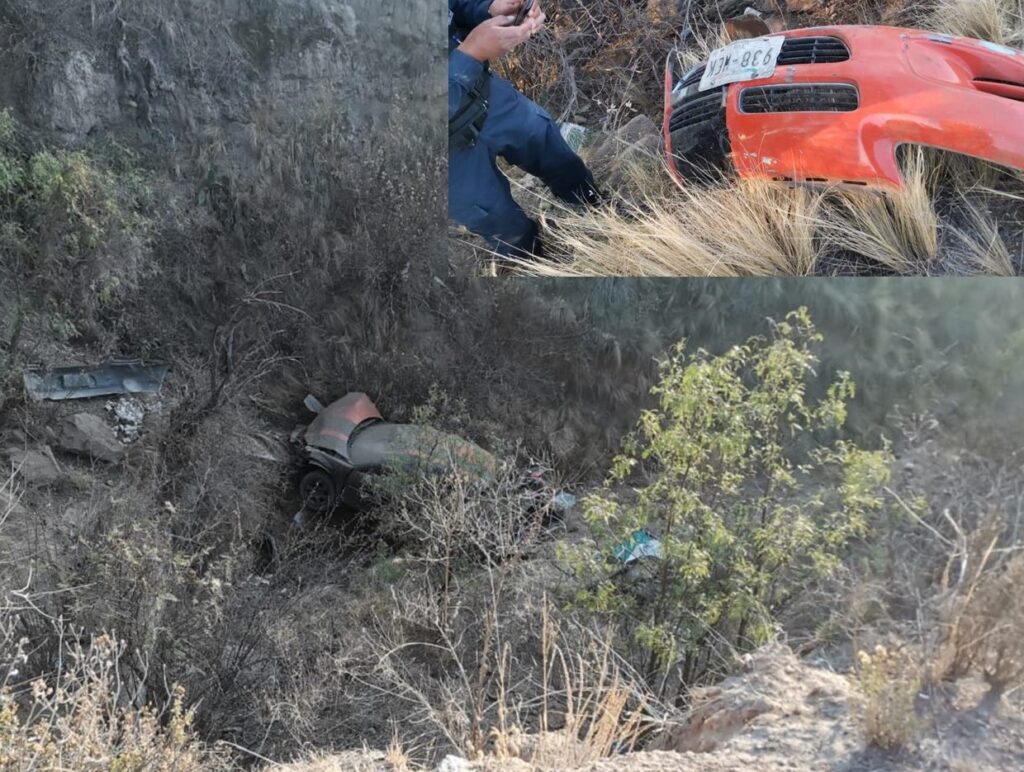 En el fondo de un barranco de aproximadamente 15 metros encontraron un coche Dodge Stratus, color negro con franjas naranja, placas antiguas del Distrito Federal 938 WEK, mismo que estaba abandonado.
