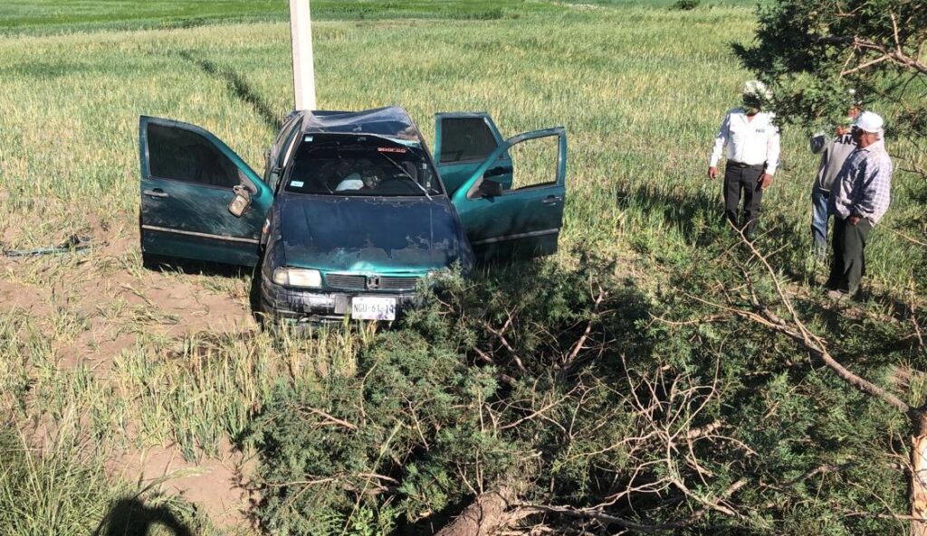 Oficiales de Seguridad Municipal y Policía Estatal se presentaron al lugar donde notaron que se salió de la carpeta asfáltica un coche Volkswagen Derby, color verde, matrícula NGU 6114, mismo que se detuvo en las tierras de cultivo.