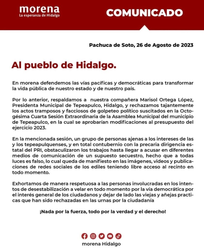 TEPEAPULCO, Hgo. – La dirigencia estatal y nacional de Morena descalifico los ataques políticos orquestados por la casi inexistente dirigencia priista en contra de Marisol Ortega López, presidenta municipal de Tepeapulco.