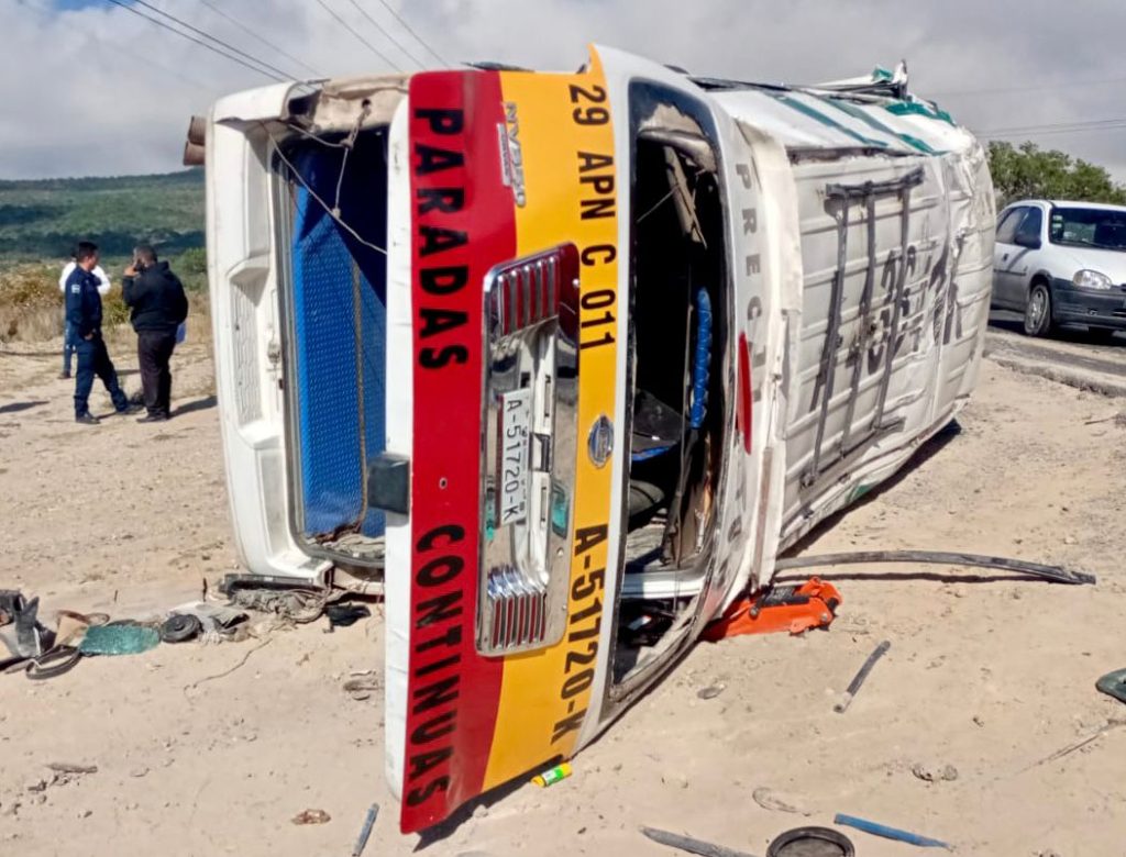 APAN, Hgo. – Por lo menos once heridos y daños materiales fue el saldo de la volcadura de una camioneta colectiva, la mañana de hoy, en la carretera Tepeapulco – Apan, a la altura del lugar conocido como “La Virgencita”.