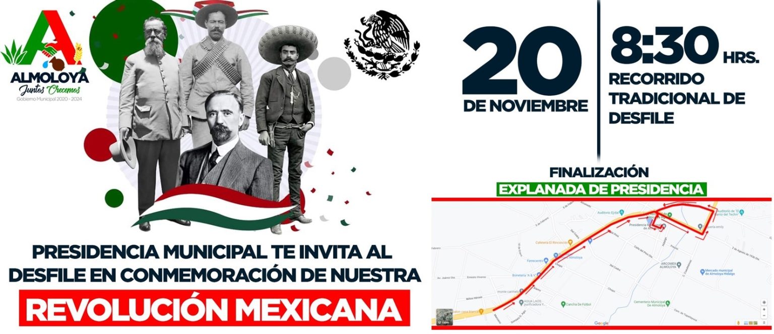 Este lunes 20 de noviembre, a las 08:30 horas, inicia el tradicional desfile que inicia en el Salón Casa Blanca hacer el recorrido tradicional hasta llegar a la explanada de presidencia municipal.