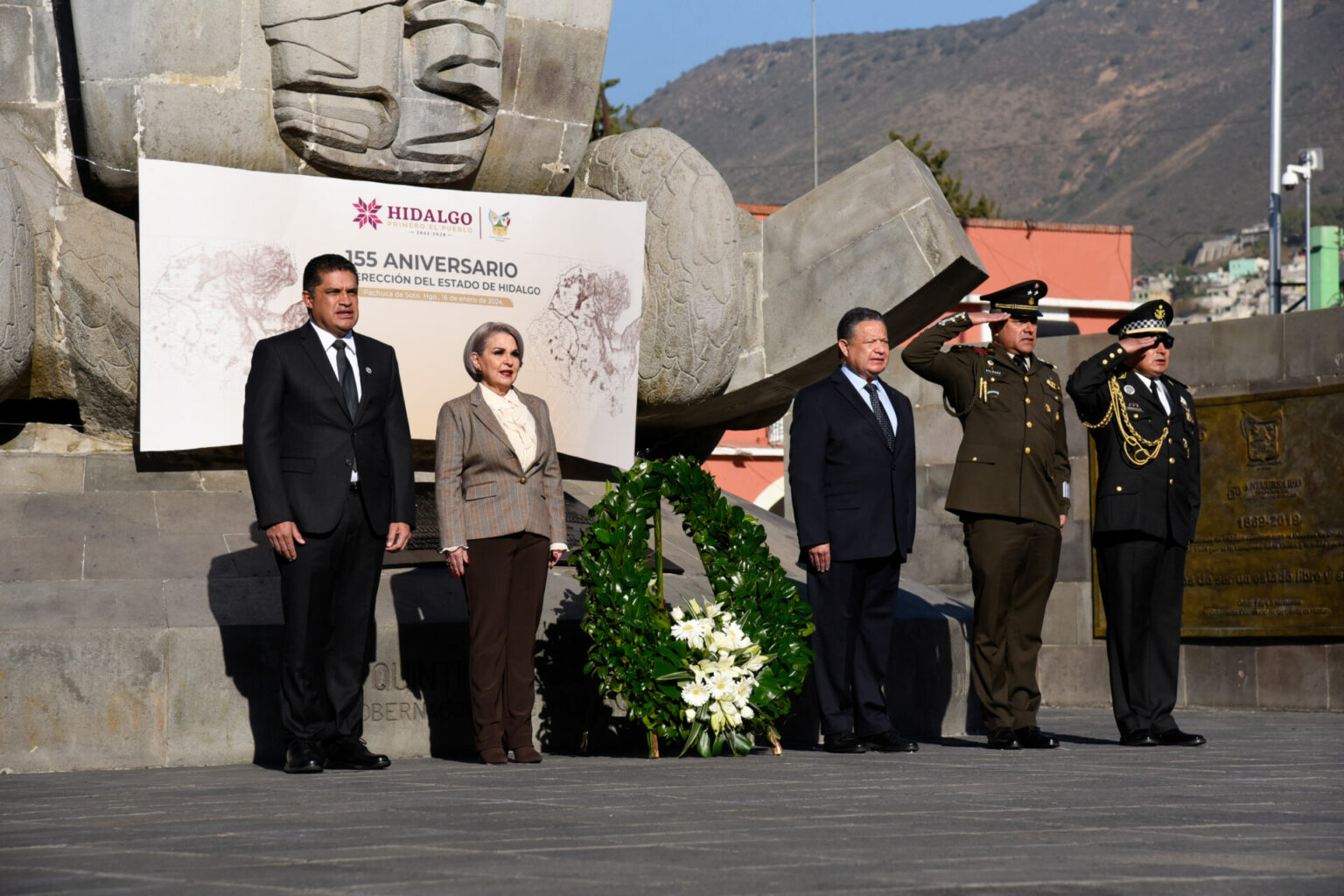 Como parte de este acto protocolario, tanto el mandatario estatal como la presidenta del Tribunal Superior de Justicia del Estado de Hidalgo, magistrada Rebeca Stella Aladro Echeverría; el presidente de la mesa directiva del Congreso Local, Julio Manuel Valera Piedras; el coordinador estatal de la Guardia Nacional en la entidad, comisario José Efraín Amancio González; el comandante de la 18va Zona Militar, general de Brigada D.E.M Alfredo Salgado, y el presidente municipal de Pachuca, Sergio Baños Rubio, depositaron una ofrenda floral y realizaron una guardia de honor.
