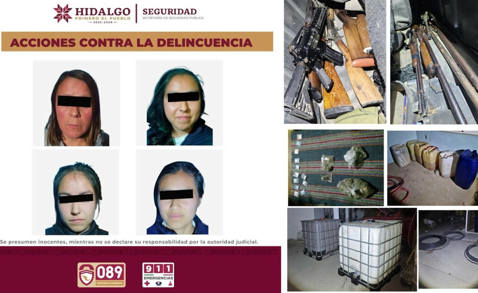 PACHUCA, Hgo. – Derivado del combate permanente contra la delincuencia, la Secretaría de Seguridad Pública de Hidalgo (SSPH) logró el desmantelamiento de tres posibles centros relacionados con el narcomenudeo y actividades de tráfico de hidrocarburos, asegurando a cuatro personas del sexo femenino junto con armas, dinero en efectivo, droga, bidones con combustible y vehículos.