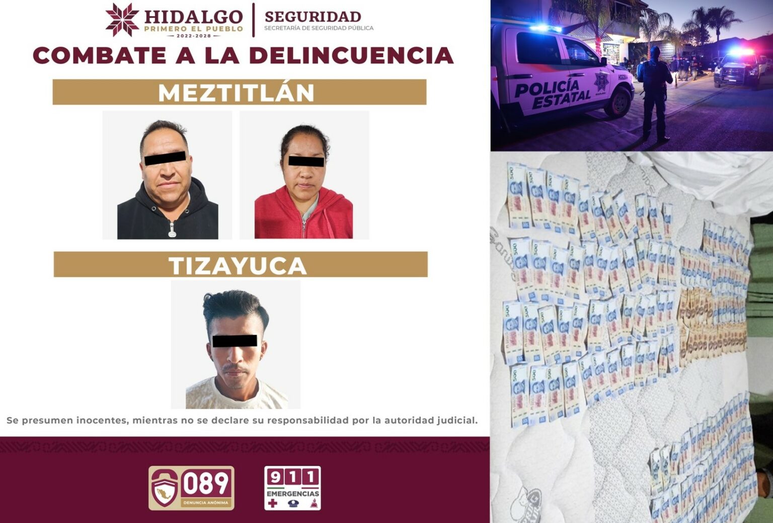 Derivado de las acciones policiales, en coordinación interinstitucional con la Procuraduría General de Justicia de Hidalgo (PGJEH), la primera intervención se realizó en la localidad Tlatepexe, municipio de Metztitlán, donde se logró la detención de una mujer y un hombre, identificados con las iniciales J. V. R. y A. H. P., alías El Poncho.